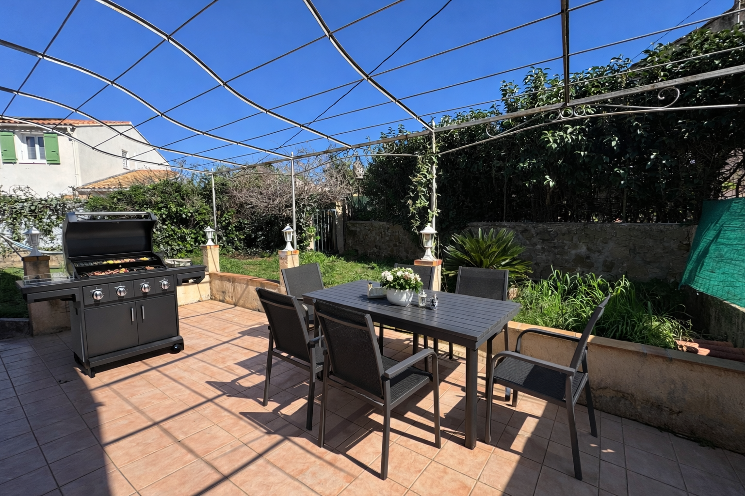 A l'extérieur, vous profitez d'un jardin avec une agréable terrasse sans vis à vis pour recevoir les amis et la famille autour d'un bon barbecue. Un garage aménagé complète le tout.